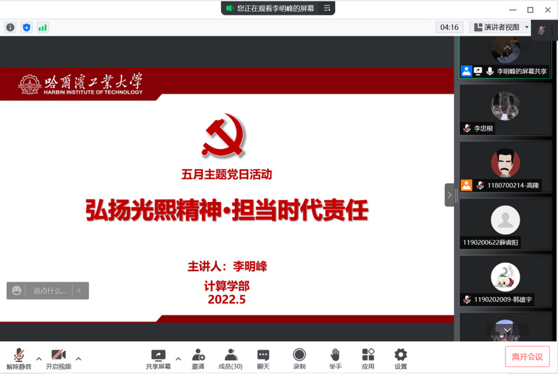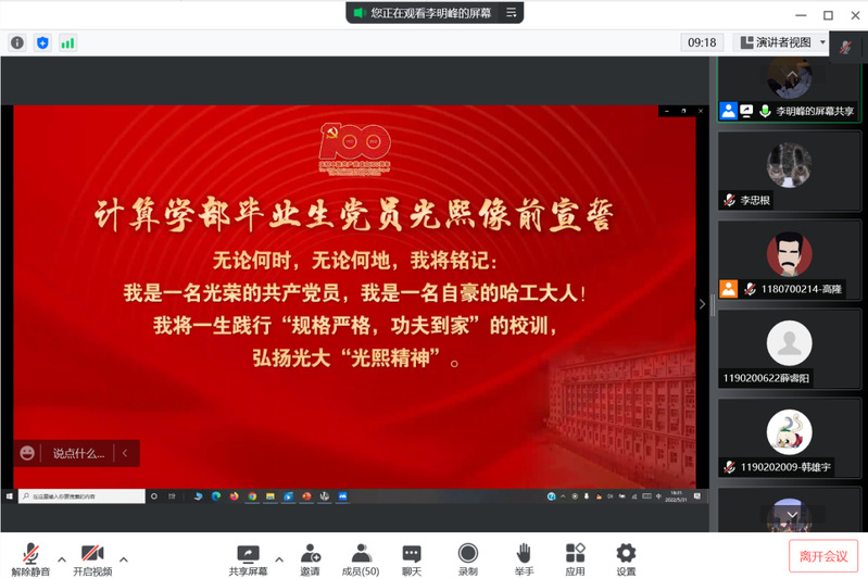 首先,李明峰与党支部的同志们一起回顾了哈工大计算机专业的创办历程以及陈光熙先生的事迹,李明峰同志指出,在计算机专业筹建和发展中,哈工大的一个重要决策便是邀请了陈光熙教授加入。随后,党支部成员一同线上观看了短片《光熙像前的毕业承诺》,短片记录了雷竞技raybet登录入口毕业生党员在光熙像前宣誓的场景,观看短片后,各位党员纷纷表示颇有感触。最后,李明峰同志勉励大家要时刻牢记“规格严格,功夫到家”的校训,传承并发扬陈光熙先生的崇高精神,发挥党员的先锋模范作用,为学校和社会的发展贡献自己的一份力量。