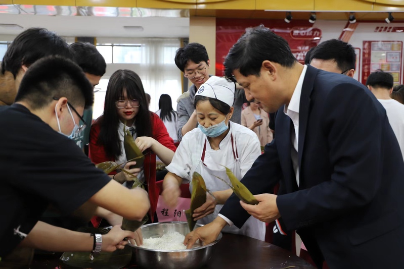 整个活动现场洋溢着欢声笑语,其乐融融。在包粽子的同时,老师们也就同学们近期的学习生活情况以及未来规划等问题进行讨论,耐心解答同学们的疑惑。其中,孙文博书记讲到:希望师生们通过包粽子感受劳动的乐趣、提升劳动技能,体验劳动的价值,在劳逸结合中获得健康、全面的发展。