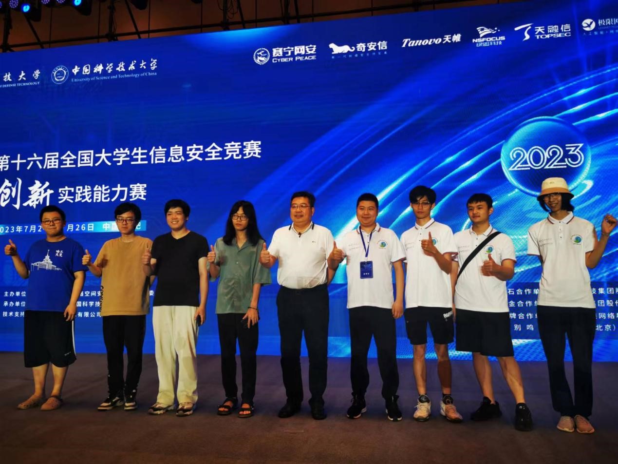 第十六届全国大学生信息安全竞赛“创新实践能力赛”全国总决赛由中央网信办指导、教育部高等学校网络空间安全专业教学指导委员会主办,国防科技大学与中国科学技术大学联合承办。于2023年7月26-27号在安徽合肥举行。竞赛共吸引全国500余所高校、2494支战队,共8242人报名参赛,经过线上初赛和分区赛层层选拔,80支优秀战队成功入围全国总决赛。我校两支战队分获一等奖和三等奖。