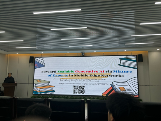 Dusit Niyato教授以《混合专家模型在生成式人工智能中的应用与发展》为题,为在场师生带来了一场高水平的学术报告。他系统梳理了混合专家模型在传统人工智能与生成式人工智能中的结构原理、发展脉络及实际应用场景,深入探讨了其在保持高性能的同时,通过优化架构与算法设计降低操作成本的创新路径,为人工智能技术的广泛应用提供了新思路。
